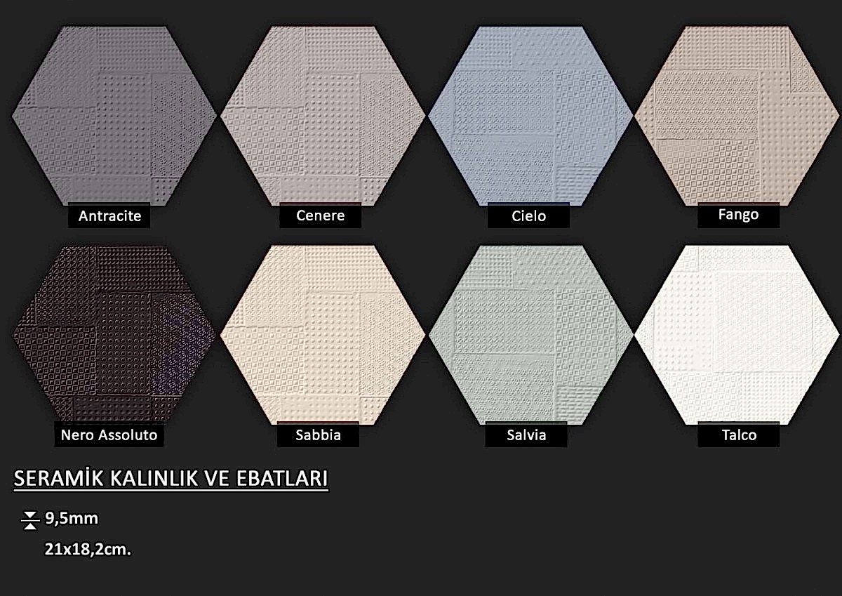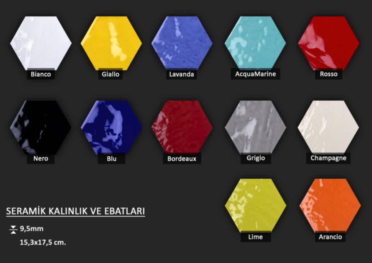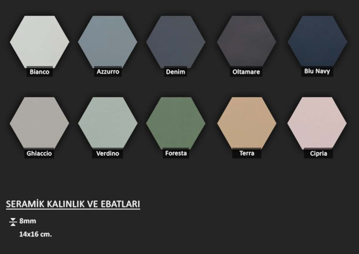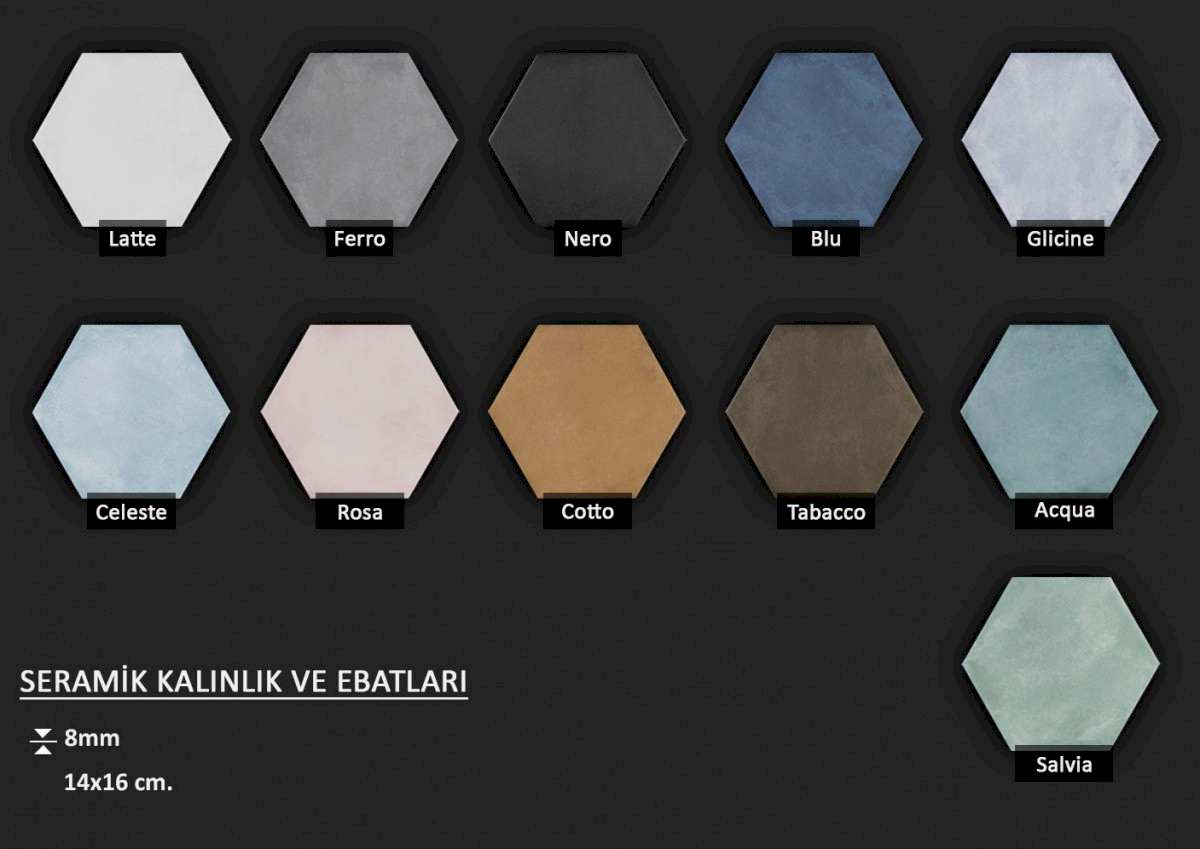 Altıgen formlu fon veya dekorlu İtalyan seramikler... Ebat seçenekleri için görsellere tıklayınız.