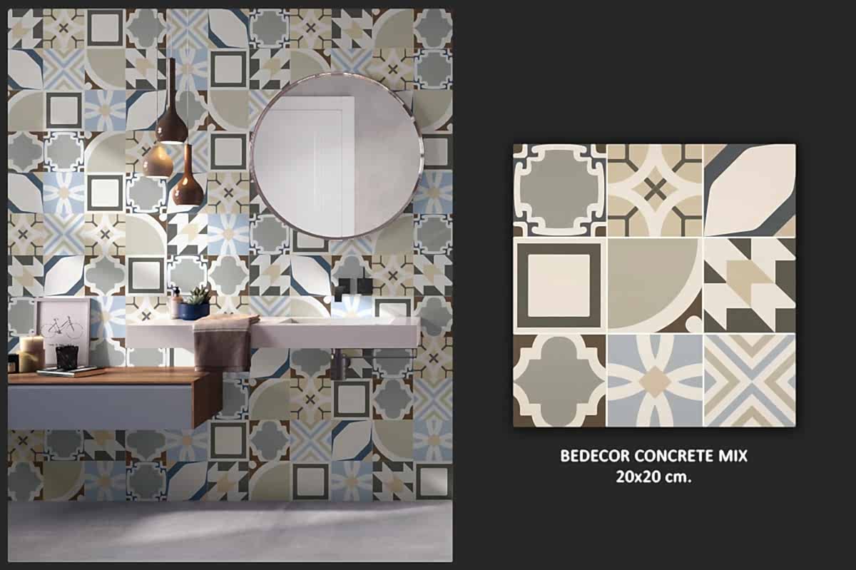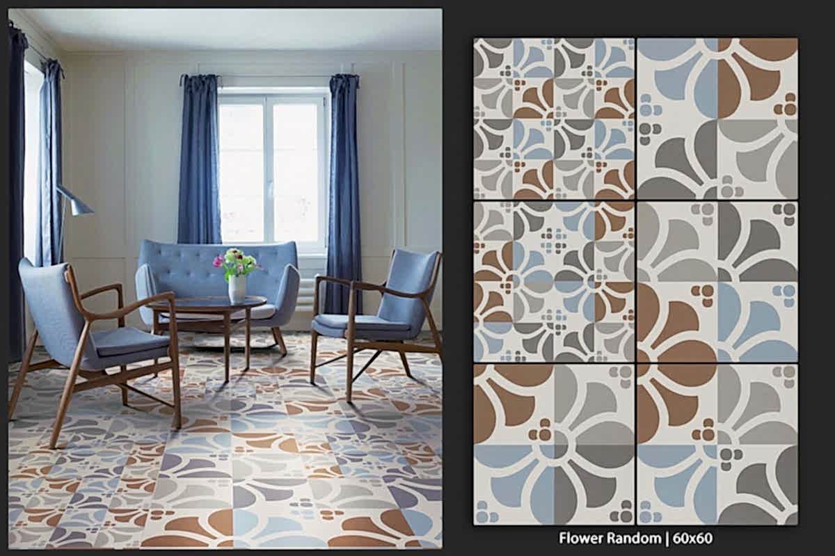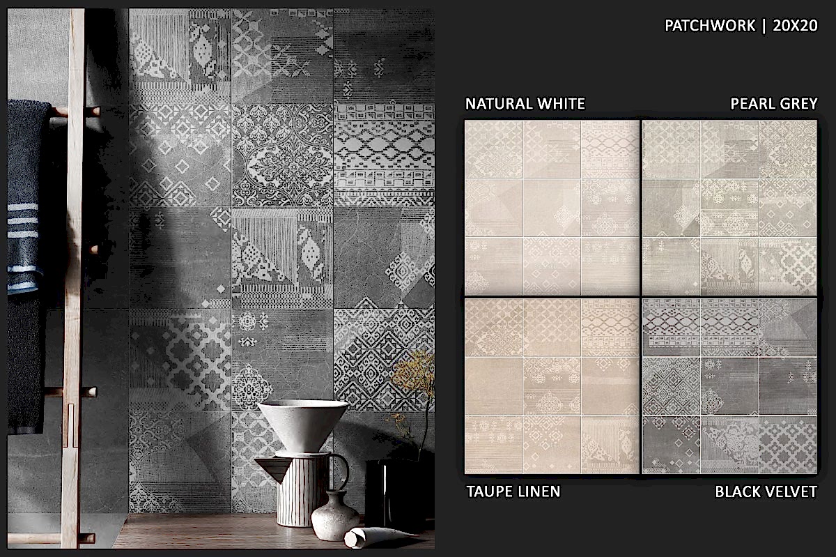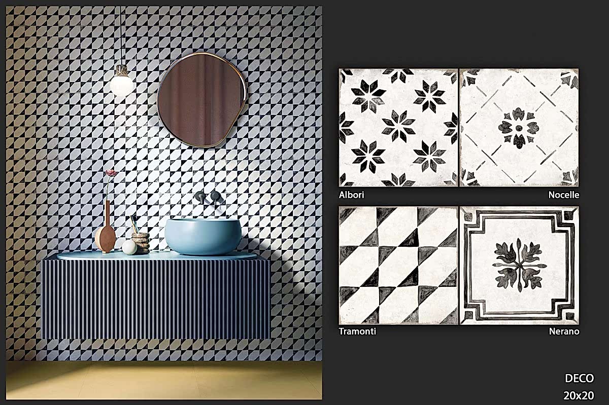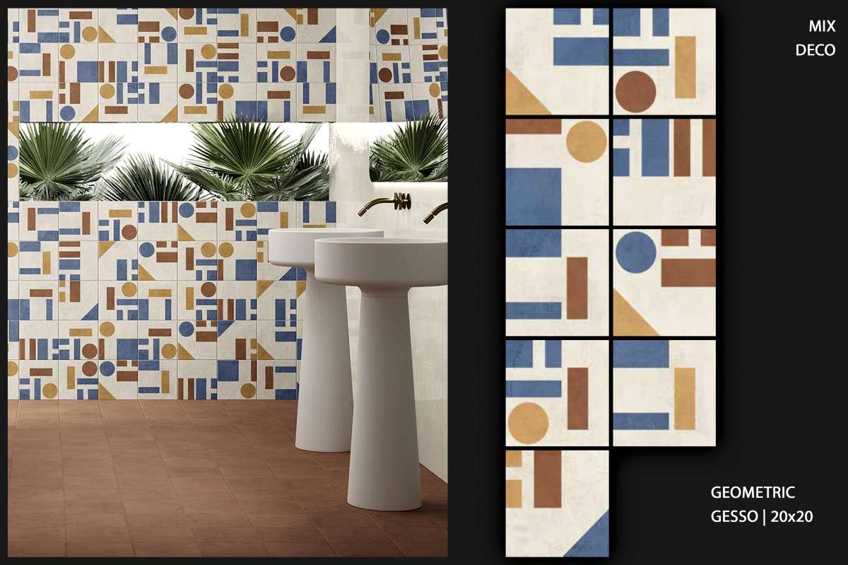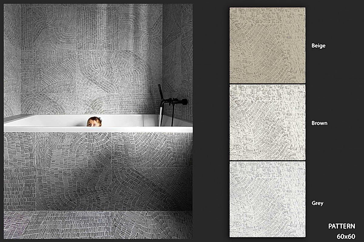 1950&1960 ve 1970 yılları seramiklerini anımsatan, dönemin zemin-duvar döşemelerinden ilham alan çeşitli desen ve renklerde porselen seramikler.